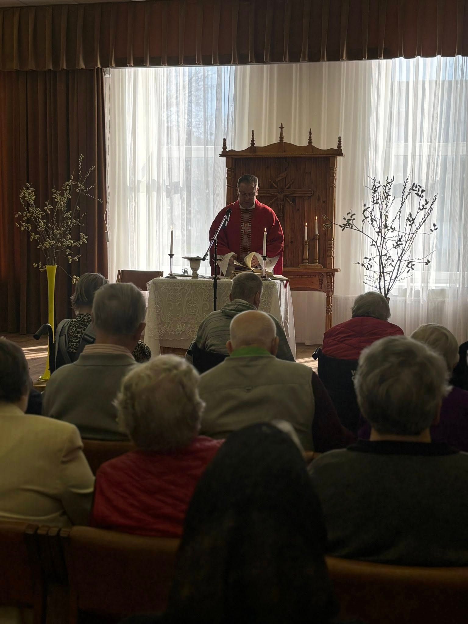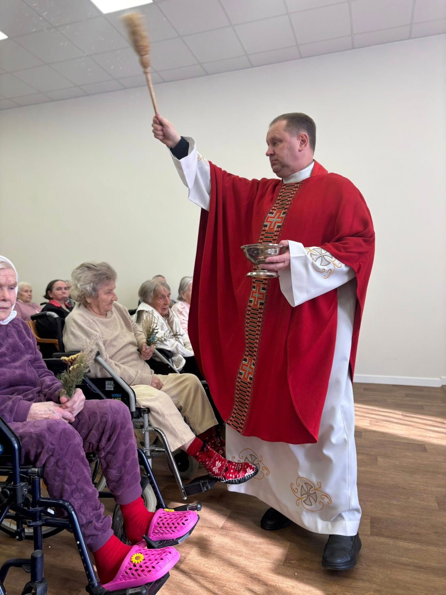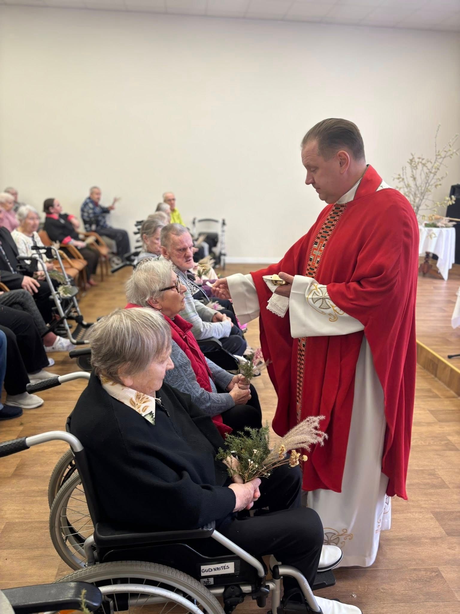Mūsų paslaugų namuose vyko Šventosios Mišios, kurias skyrėme Verbų sekmadieniui ir artėjančiai Velykų šventei. Kartu meldėmės už sveikatą, ramybę ir džiaugsmą, kuris kyla iš Kristaus prisikėlimo pažado.